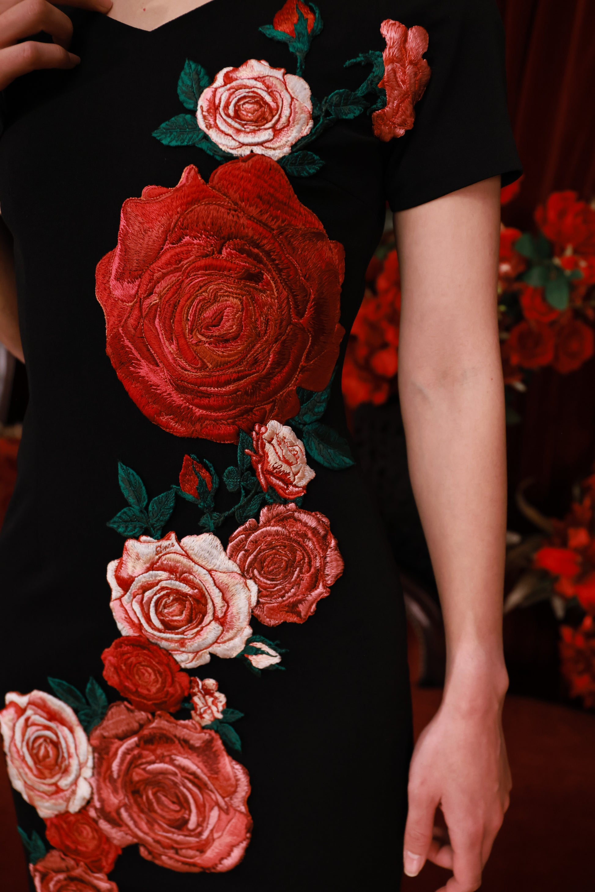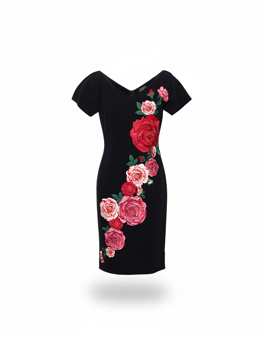 シャープなシルエットに、繊細な刺繍で描かれた薔薇のモチーフを重ねた一着。