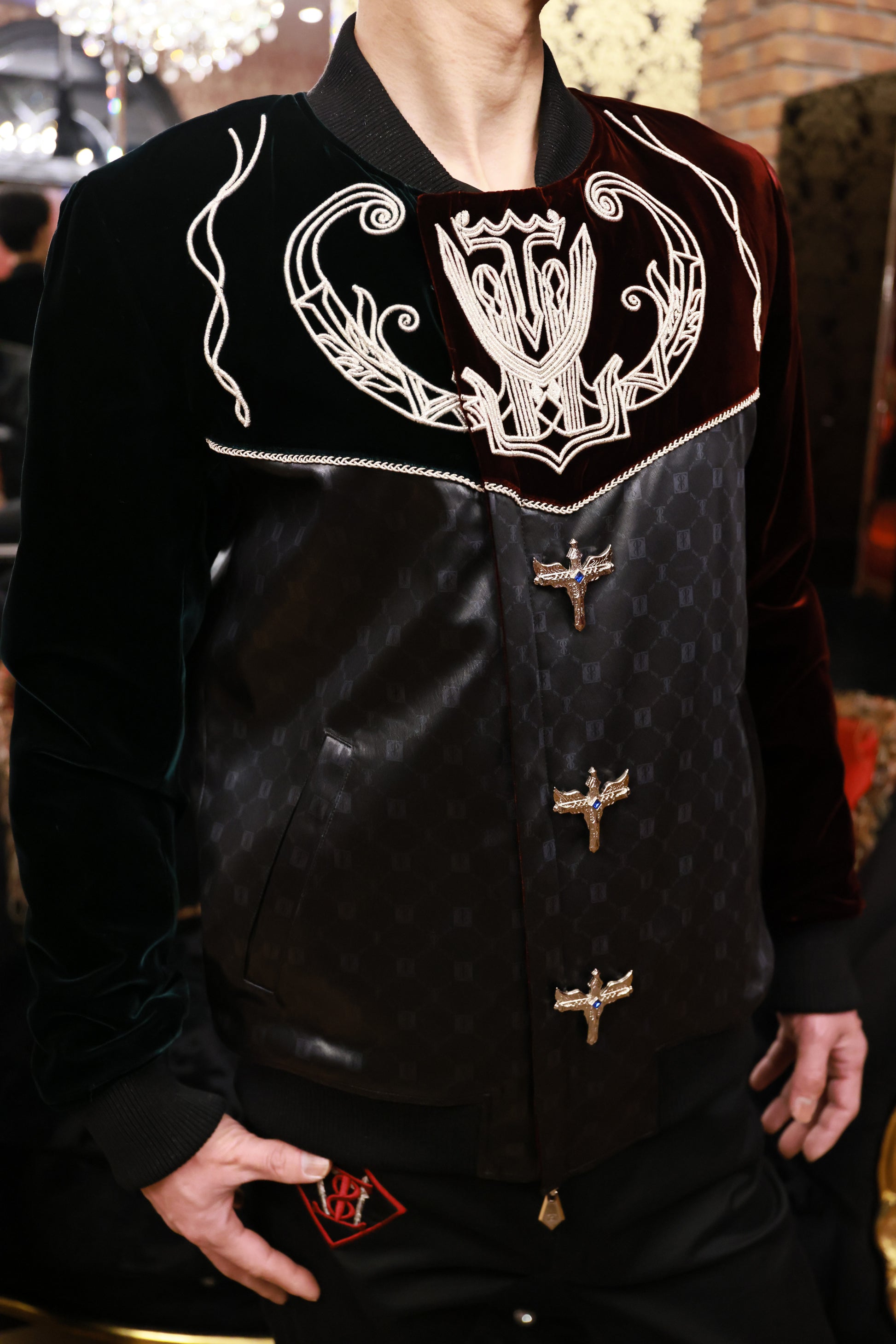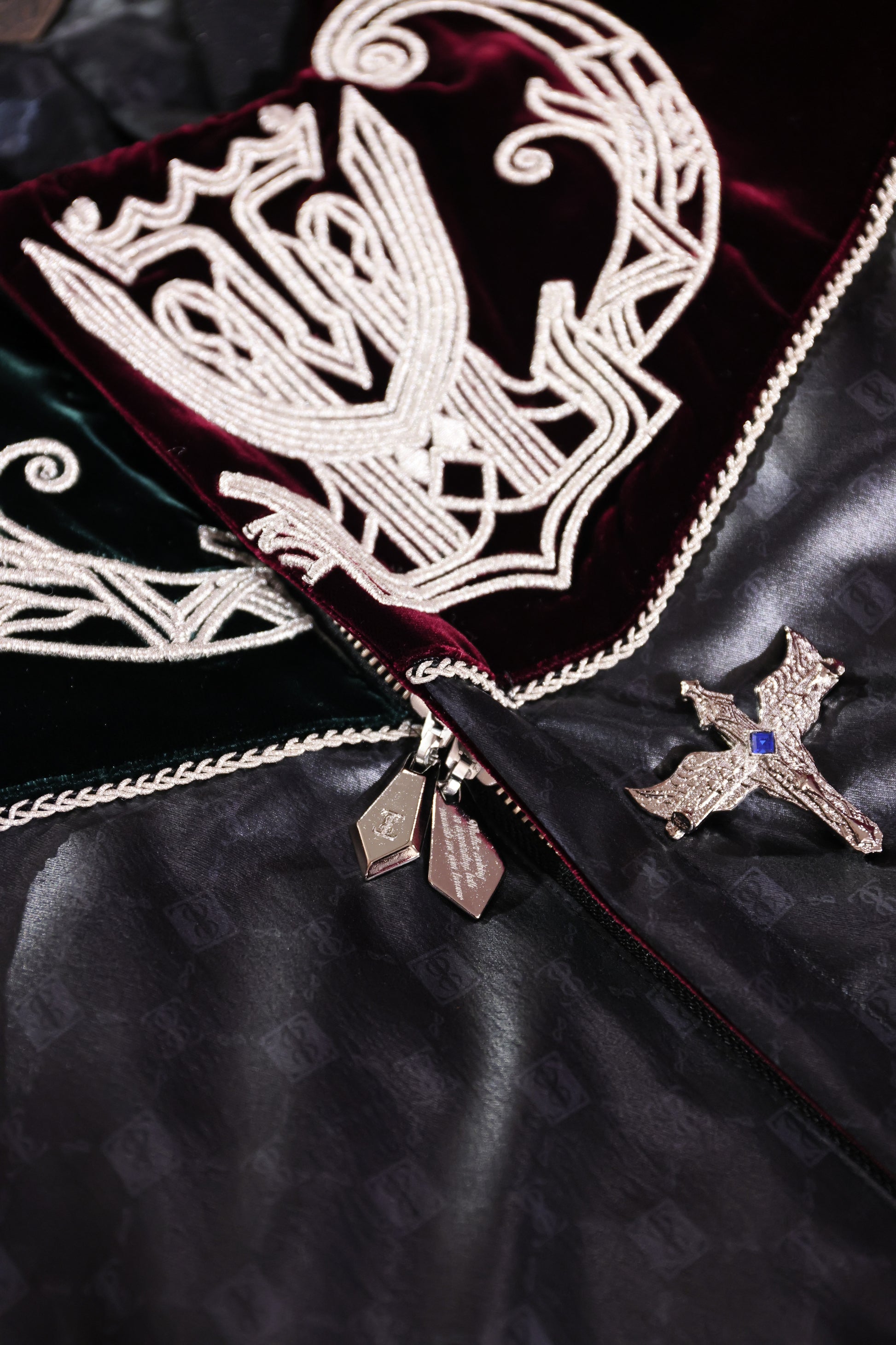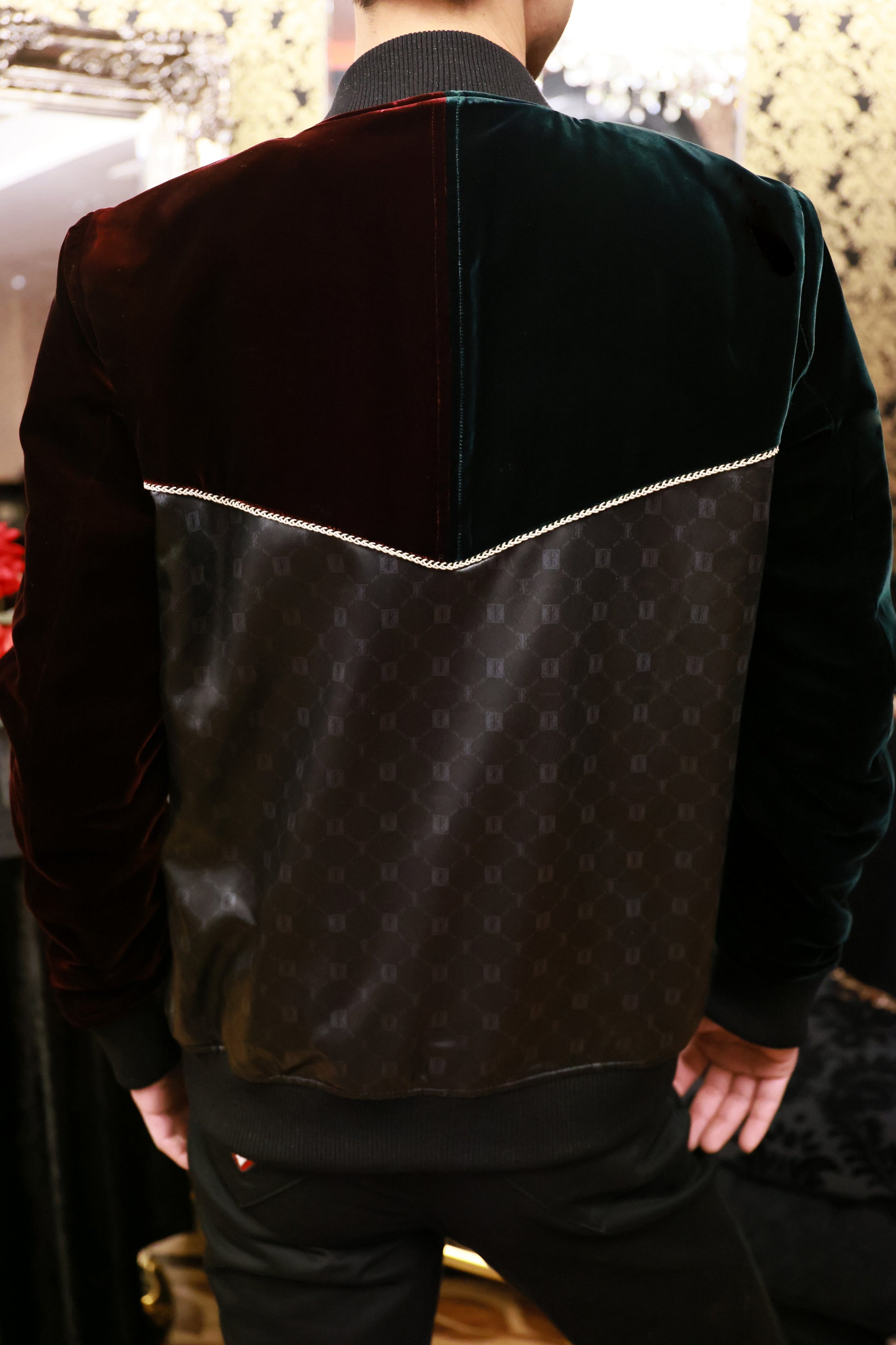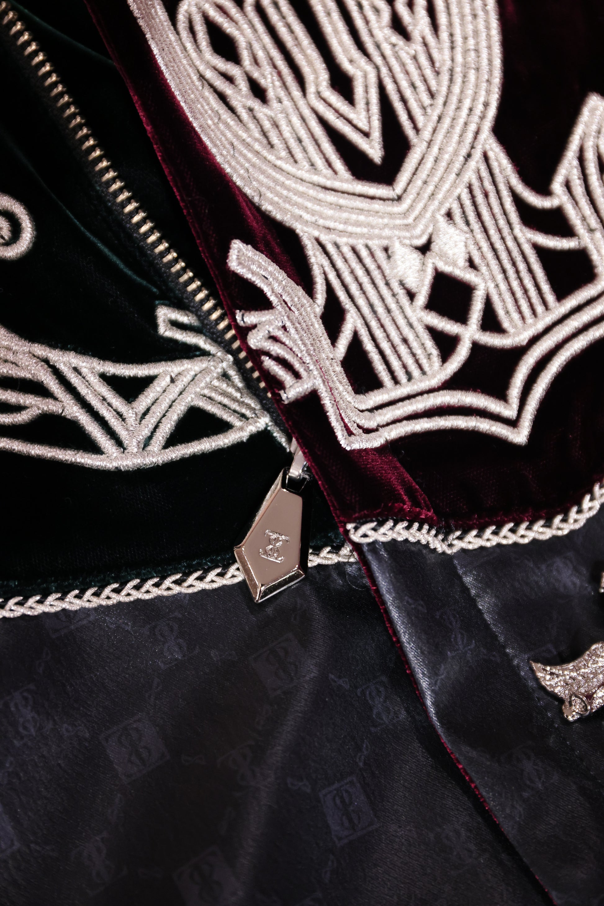 ブルゾンの上部の生地が深みのあるグリーンとボルドーのベルベットでアシンメトリーになっているのは、愛の発信と受信を意味し、王としての強さを見出しながら絶対的な安定感を引き出してくれます。ボタンや素材使い、裏地やファスナーなど手に取った人にしかわからないディテールの遊びが施されている永遠なる叡智を象徴するブルゾンです。