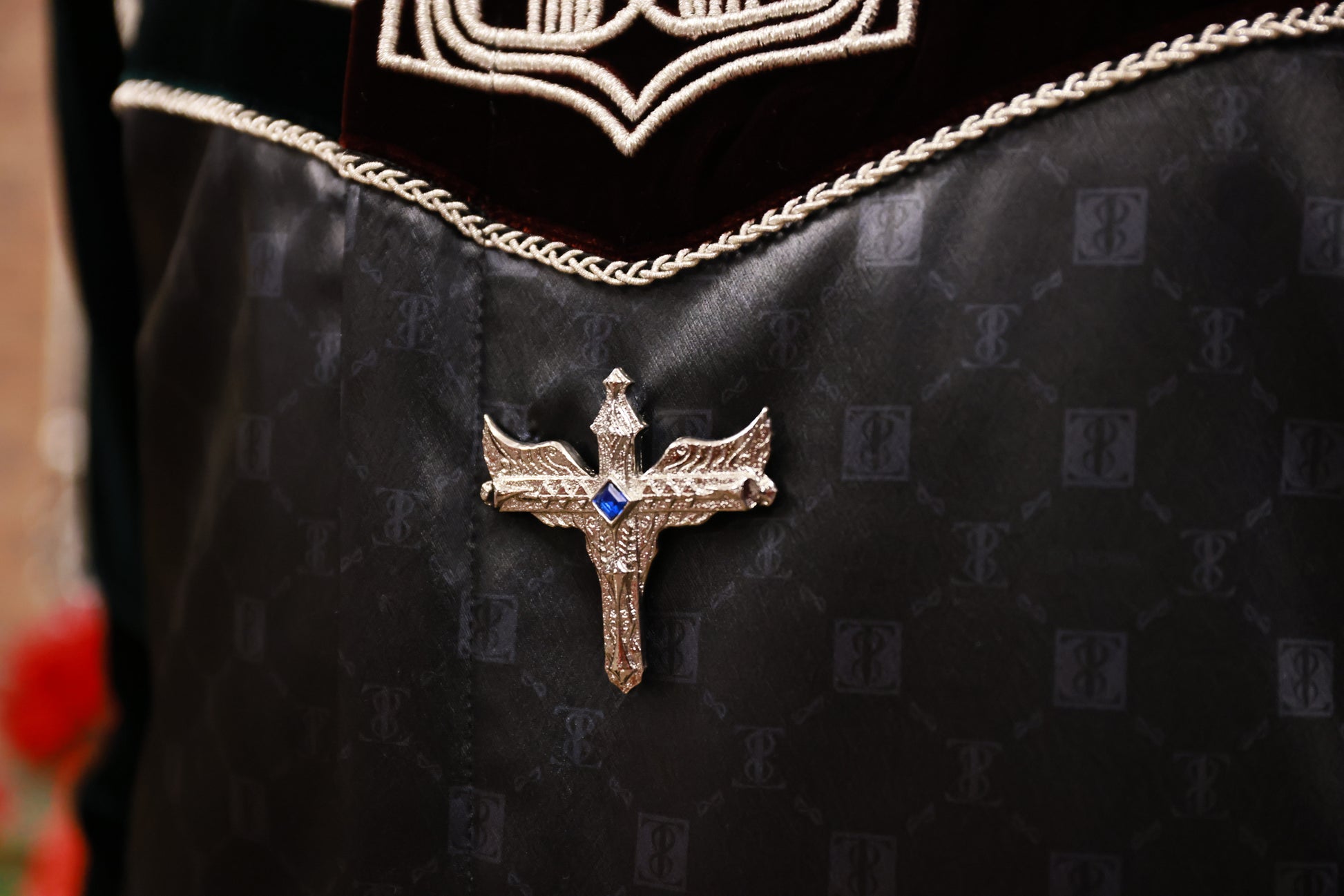 彫刻的な印象を与える立体刺繍で施された紋章には、王が奏でるパイプオルガンの音色が世界中に広がり、その音楽とともに男性の強さ、勇ましさ、魅力や輝きも広がっていくという意味が込められています。